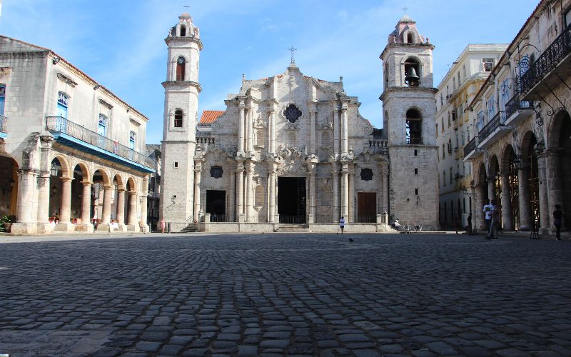 Katedra w Hawanie, nazywana przez Alejo Carpentiera „muzyką zaklętą w kamieniu”, wyróżnia się barokową fasadą i asymetrycznymi wieżami. Jej budowę rozpoczęli jezuici w 1748 roku, a ukończono ją w 1787, kiedy powstała diecezja hawańska. Przez ponad sto lat spoczywały tu szczątki Krzysztofa Kolumba, zanim przeniesiono je do Sewilli. Wnętrze świątyni zaskakuje skromnym, neoklasycystycznym stylem – można tu podziwiać XVIII-wieczne freski oraz kopie dzieł Murilla i Rubensa.